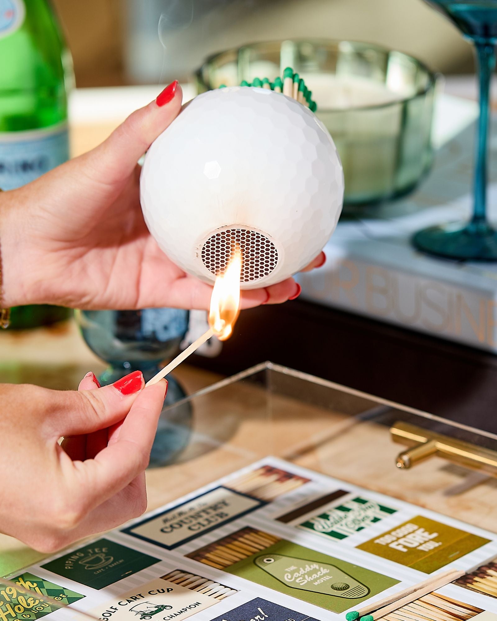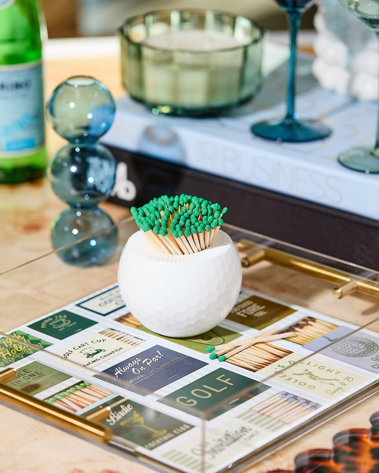 Get fired up with our Golf Ball Match Striker! This match strike is the perfect accessory for your coffee table, desk, or any space that could use a little flair. It features a strike pad on the bottom and comes with 140 matches. Keep this baby ready for any occasion, let's get lit!