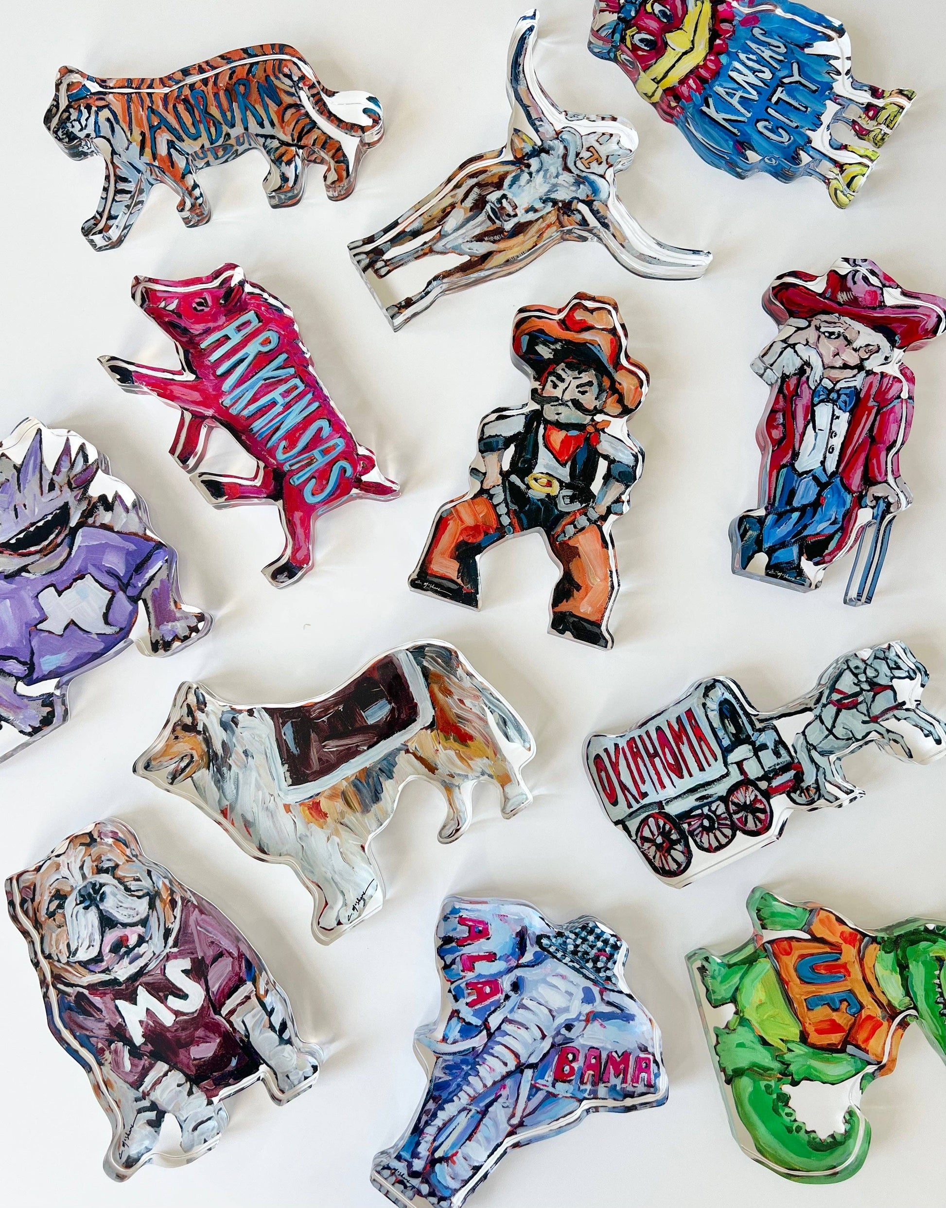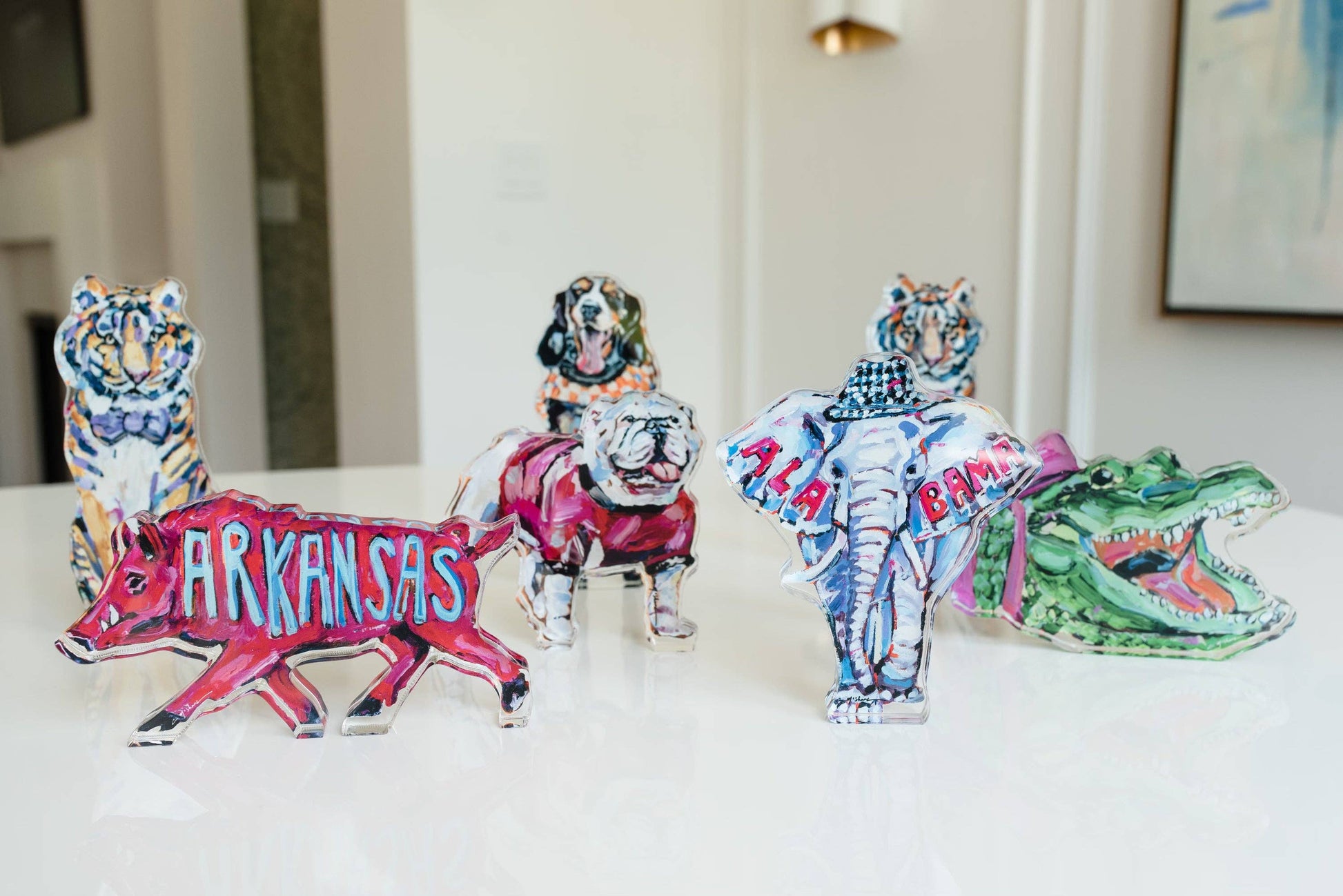 These lucite tabletop blocks make the perfect bridesmaids, hostess, or teachers gift. -All acrylic sizes vary depending on design. The minis are on average 2.5 X 4.5", 1/2" thick Disclaimer: This artwork is inspired by the spirit of game-day and is intended for those who celebrate their love of sports and traditions. It is not affiliated with, licensed by, or endorsed by any college, high school, university, or sports team, including Ole Miss. All trademarks, logos, and school names are the property of their respective owners.