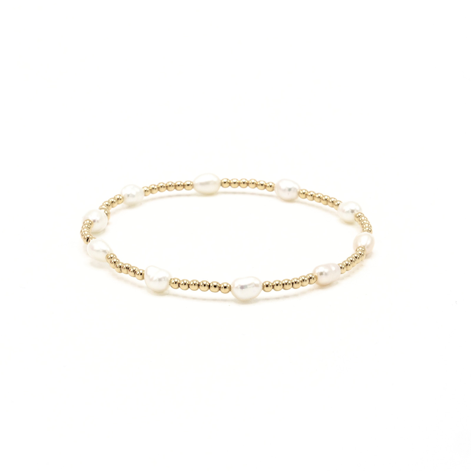 This delicate stretch bracelet features natural rice pearls, each uniquely shaped, paired with 14k gold-filled waterproof beads for lasting beauty. Perfect for wearing alone or layered, it’s part of our erin gray waterproof collection.