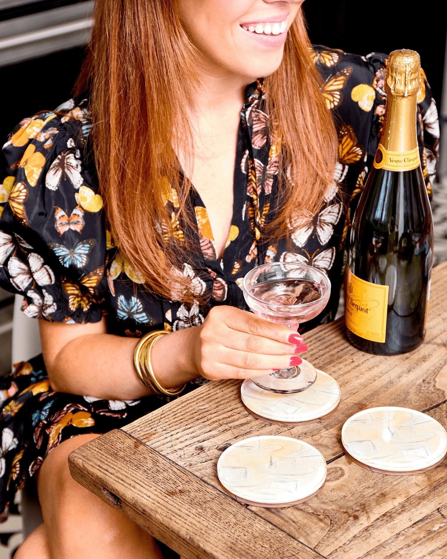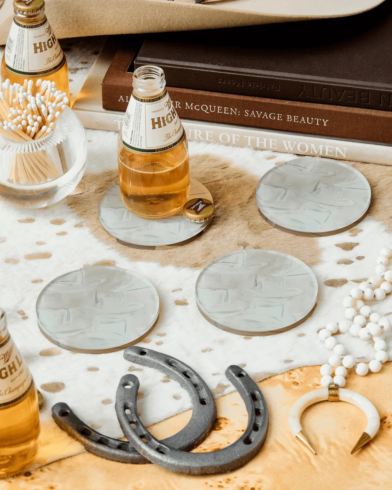 Get ready to lasso some style with the Wrangler Coaster. This acrylic coaster is perfect for hosting or sprucing up your coffee table, featuring whimsical white cowboy hats hand-painted by Emma Katherine. Yee-haw!